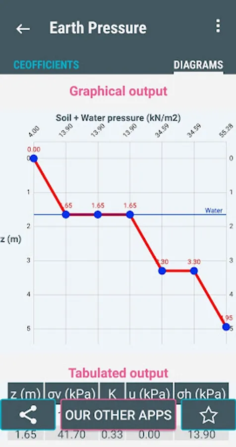 (2) The geotechnical engineering / civil engineering app calculates the lateral coefficients of earth pressure Ka and Kp