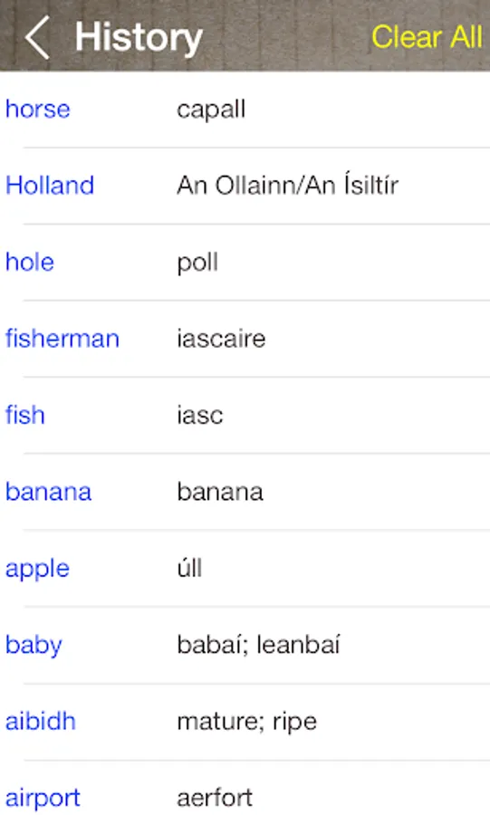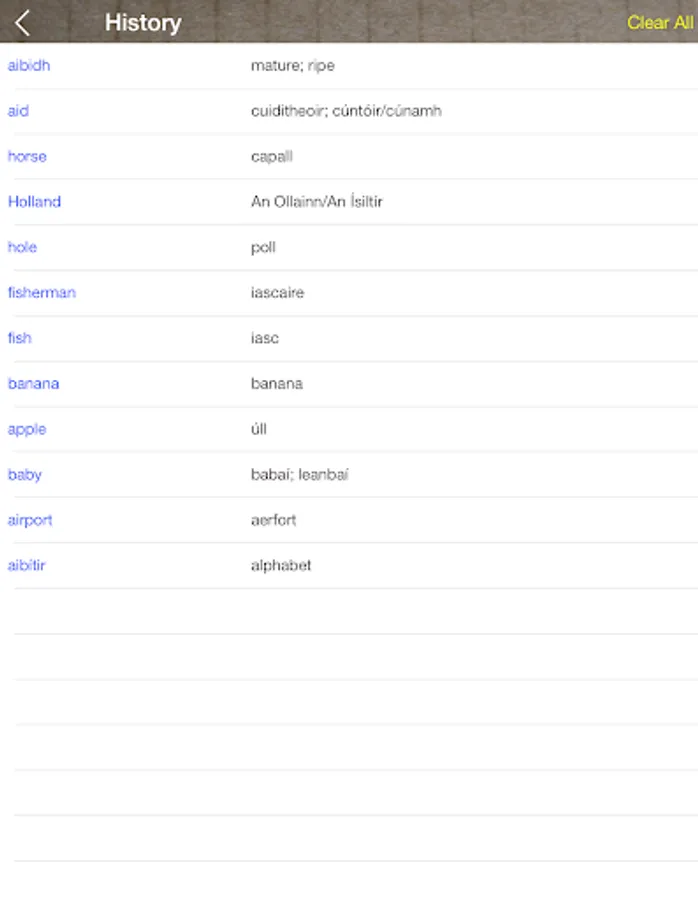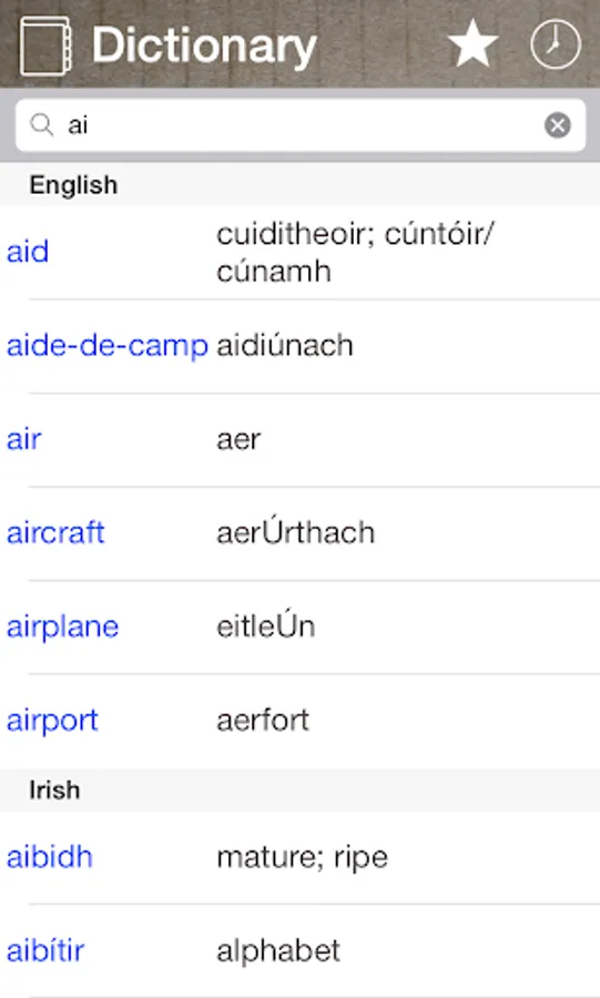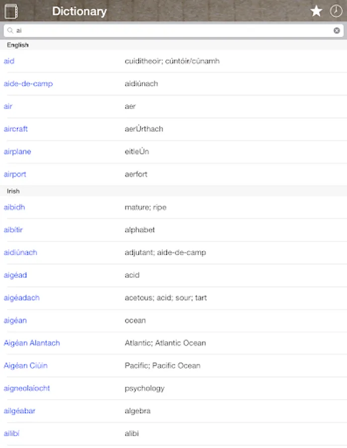 In the dictionary, you can search and translate in two direction, i.e. English to Irish or Irish to English. More than translation, you can learn to speak the phrases or vocabulary in English languages of correct grammar. This app is the best for languages leaner, beginners and kids, Bring the app with you when you are having lessons or courses.
