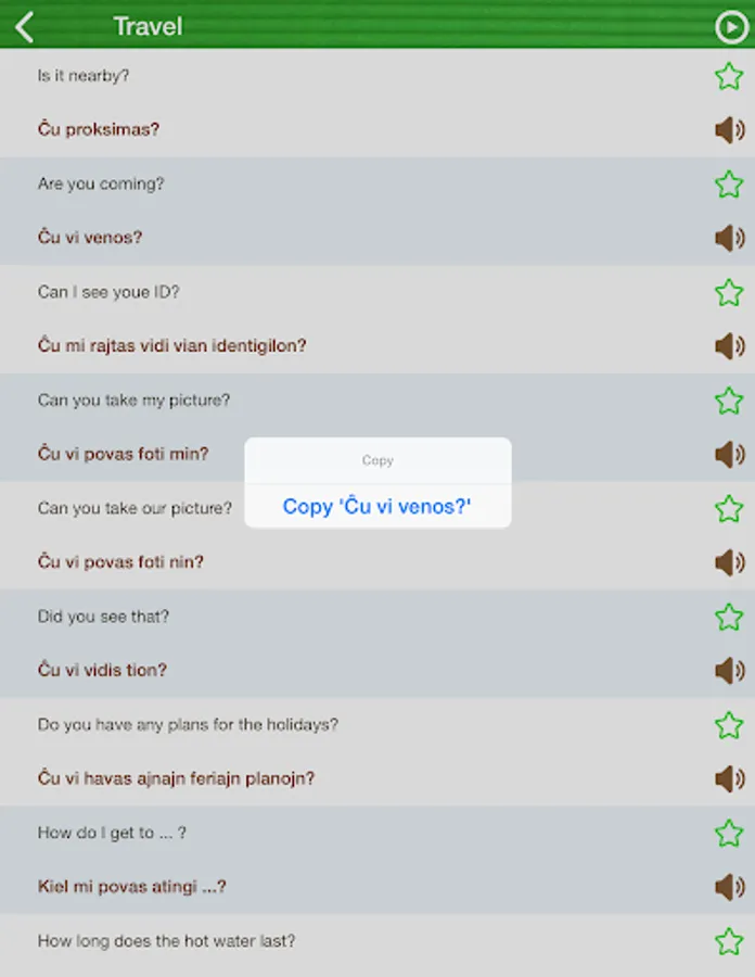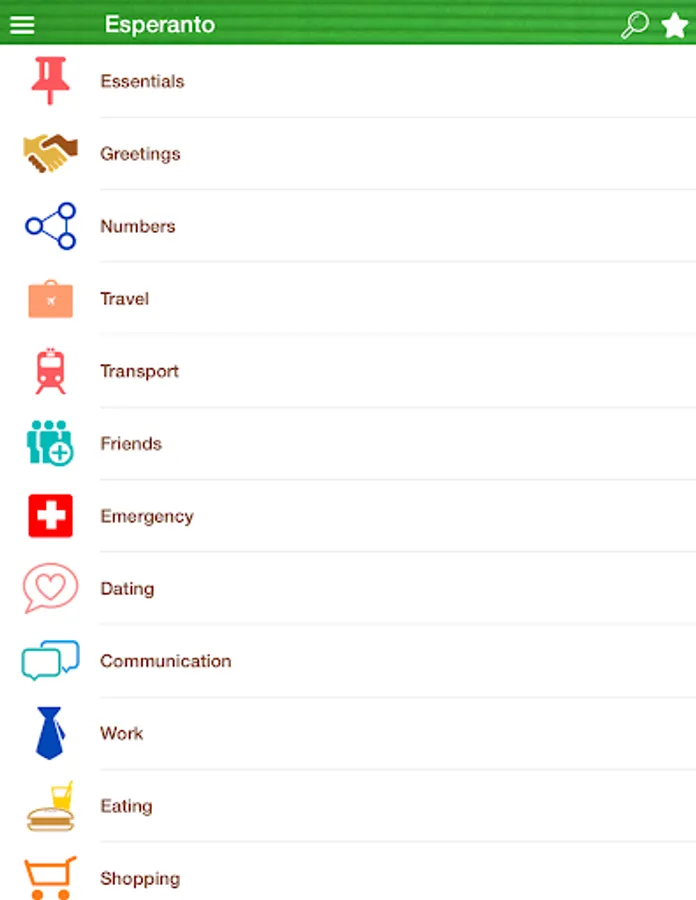 The Learn Esperanto Phrasebook is a high quality and user-friendly Phrasebook app available on phone and tablet. And it is FREE! It will bring you an excellent and delightful learning experience!
