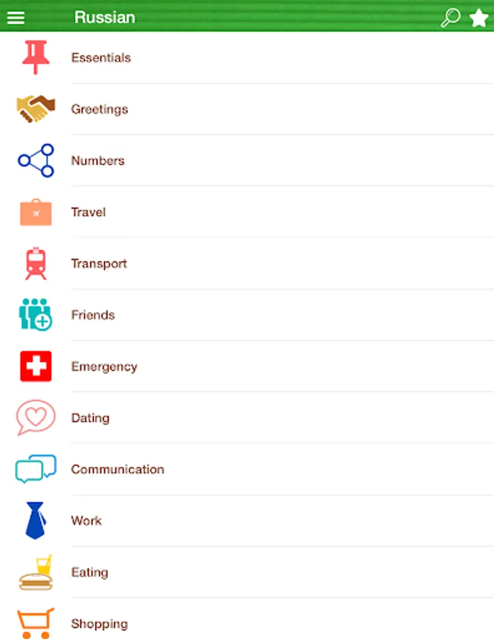 The Learn Russian Phrasebook is a high quality and user-friendly Phrasebook app available on phone and tablet. And it is FREE! It will bring you an excellent and delightful learning experience!