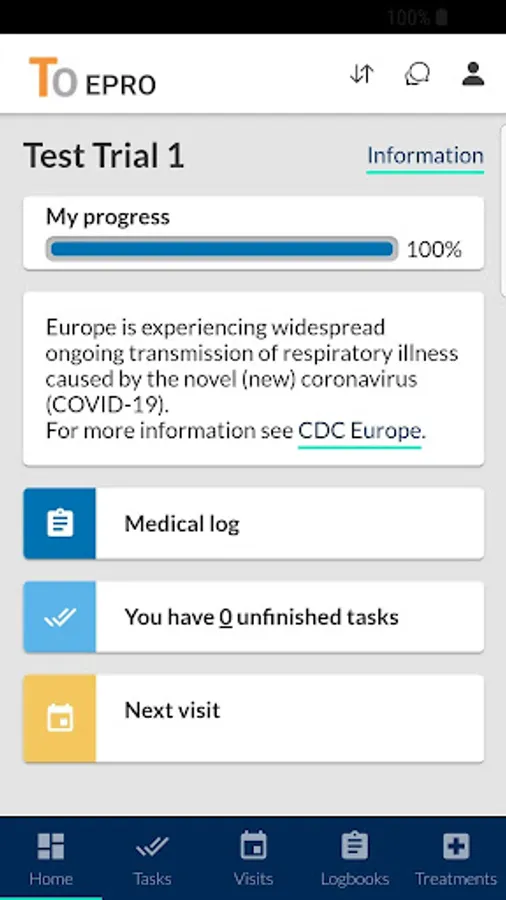 This app is used for participants in clinical research projects. The app is the patient portal for data that will be gathered from patients during clinical trials. Healthcare personnel who manage the clinical trial will invite patients to use the app by sending a registration code and get access to study-specific questionnaires. The app also includes a communication module to use for Site-to-Patient communication during clinical trials. This enables communication via video calls, voice calls, and text messages.