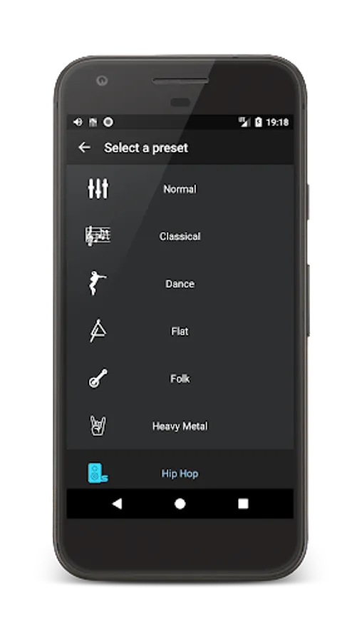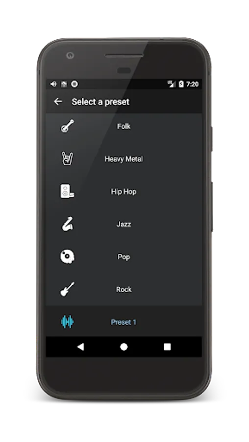 With equalizer, you can regulate volume of frequencies. Loud low frequency is good for music with beats and bass, Hip-Hop, Rap. For Rock music, Jazz Music, Pop Music, R&B Music it is good to increase middle frequency and high frequency. In “Equalizer with Bass Booster for Headphones” you can choose one of the standard volume settings — music presets: Flat, Normal, Rock, Folk, Dance, Heavy Metal, Jazz, Pop. You can choose one of them when you listen to music. Or you can make your own preset and save that volume of frequencies and name it.