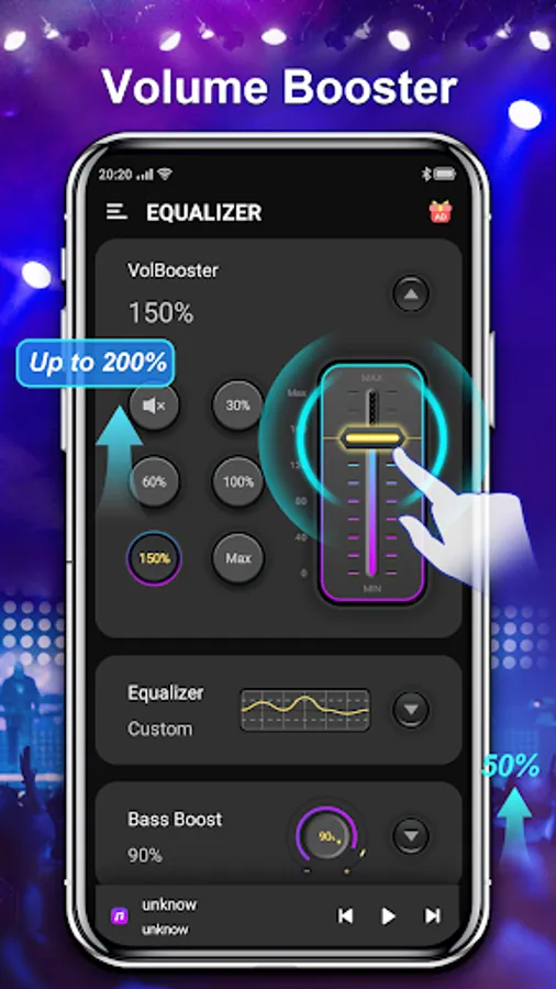 With free installation & easy usage, you can adjust the frequency of your songs, boost the bass & volume loudspeaker, control the sound, listen to awesome music and get your bass boosted with this 3D Equalizer!
