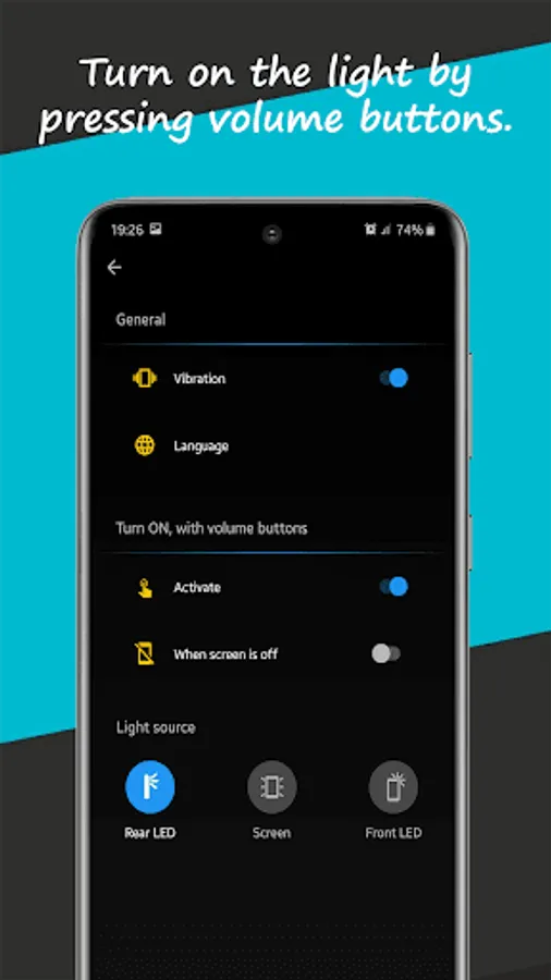 If you need to turn on the light fast, this app has a feature that allows you to turn on the flash with pressing both volume buttons at the same time, just like a physical flashlight with physical buttons.