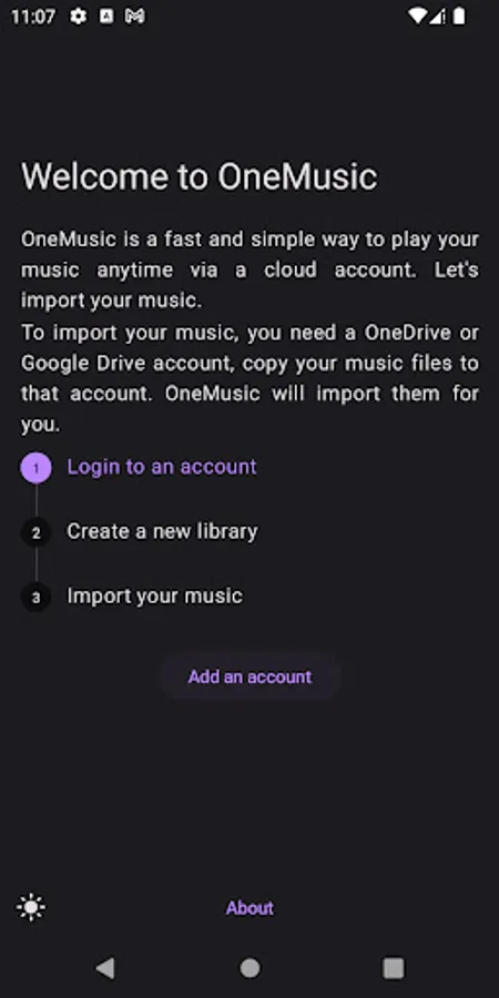 With OneMusic, you can play your music anytime and anywhere. Just copy your music files to an OneDrive or Google Drive account, log in to the account and import them by OneMusic. Your music will be available on this device.