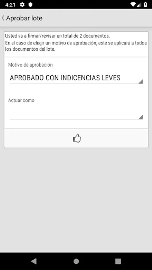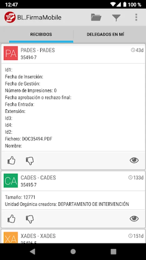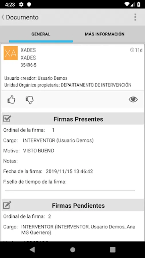 Application for mobile devices that allows users of FirmaDoc BPM to perform the acts of approval or rejection of documents. It constitutes the first mobile version of FirmaDoc, with a scope exclusively in signature-holder mode, but which in future versions will become another perspective to be added to the existing ones of FirmaDoc and FirmaDoc web, as document manager, electronic signature and file tracking electronic devices in mobile devices. It represents a service of great added value, facilitating maximum efficiency in internal management, since it allows eliminating dead times in the document processing circuit of an administrative file for absences or displacements, since the user will have in his pocket the possibility to electronically sign documents anytime, anywhere.
