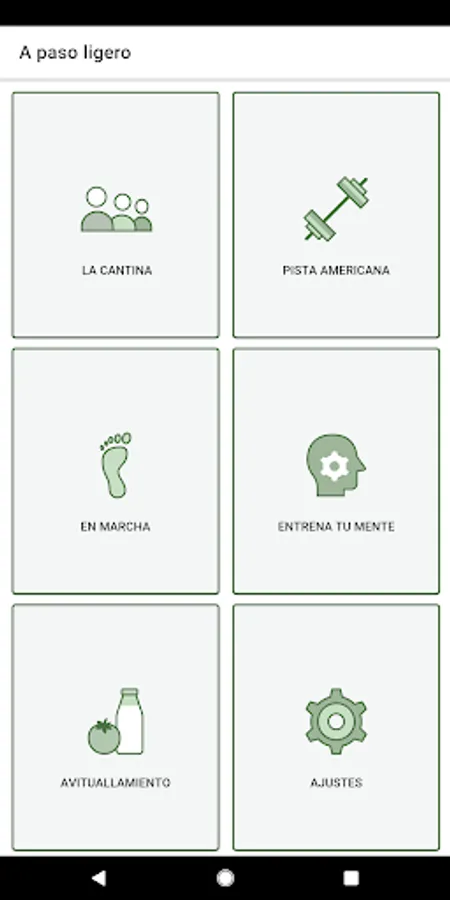 With a simple interface and a menu set in military life, users of this APP can perform guided exercises to keep fit in our "American Track" section; go for a walk and count km, steps or calories consumed; perform exercises and games that will help keep your mind agile and prevent neurodegenerative diseases; receive advice on food in “Provisioning” and stay informed about the activities that, free of charge, will be programmed from ACIME to face full maturity.