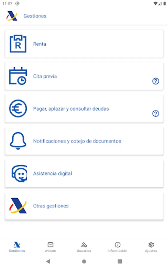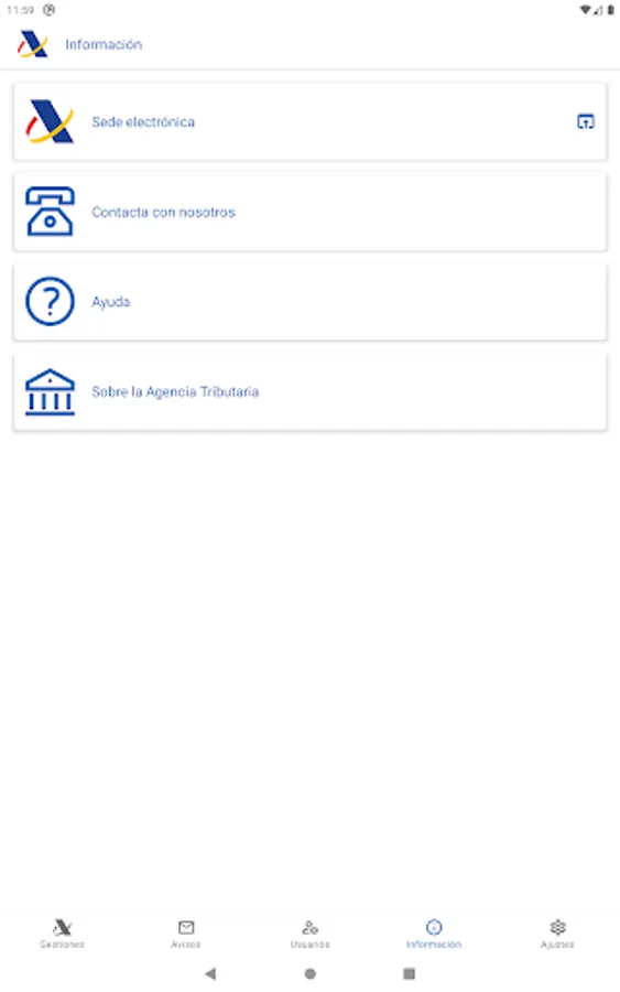 You can consult the privacy policy (https://sede.agenciatributaria.gob.es/Sede/avisolegalApp.shtml), the terms of service (https://sede.agenciatributaria.gob.es/Sede/terminosservicioappaeat.html) and the accessibility statement (https://sede.agenciatributaria.gob.es/Sede/accesibilidadApp.shtml) also in the APP.