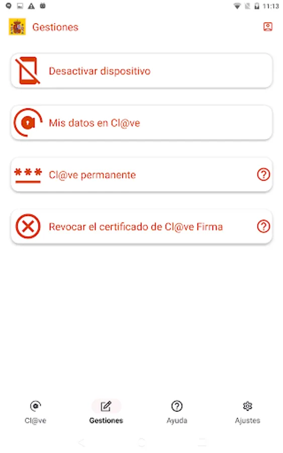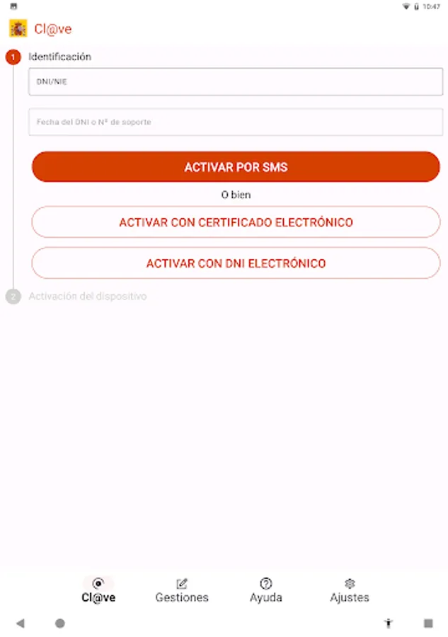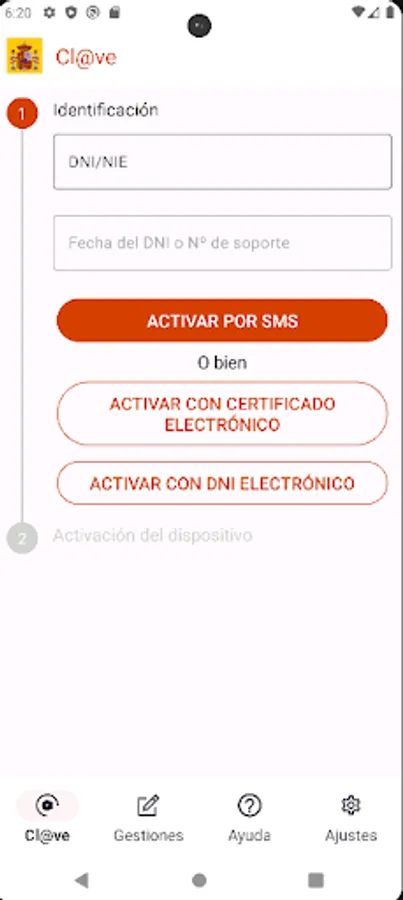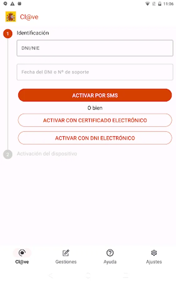If you are registered in Cl@ve, you can activate this device with your DNI/NIE by means of an SMS or with your electronic certificate.