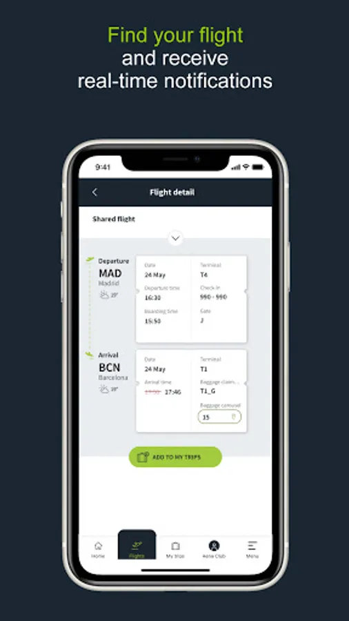 • Receive real-time notifications and custom offers: terminal of arrival or departure, check-in desk, departure gate, baggage claim, discount coupons, etc.