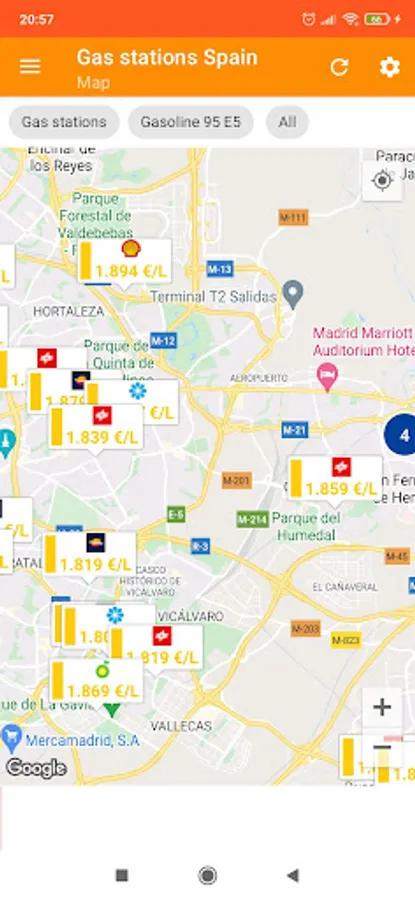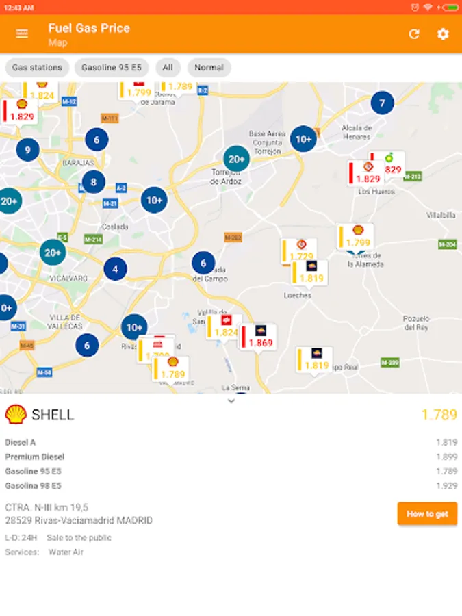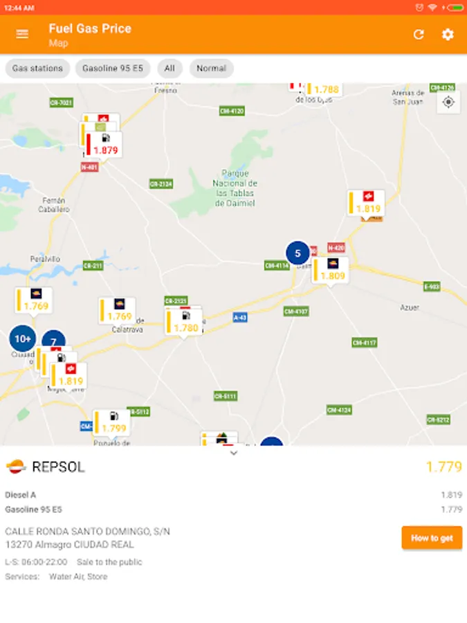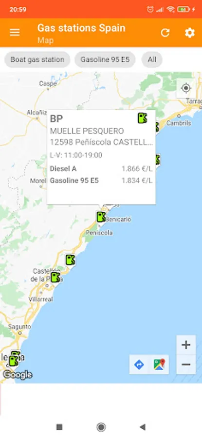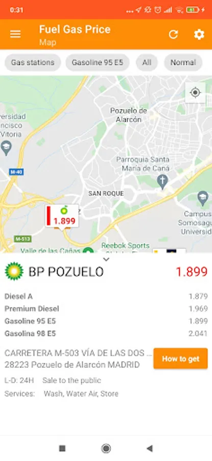 Gas Stations Spain allows you to find the gas stations in Spain with the best prices on all types of fuel: Gasoline 95, Gasoline 95 E5, Gasoline 98 E5, Gasoline 98 E10, Diesel, Improved Diesel, Diesel A, Diesel B, Diesel C, Biodiesel, Bioethanol, LPG, CNG, Hydrogen and Diesel for maritime use.