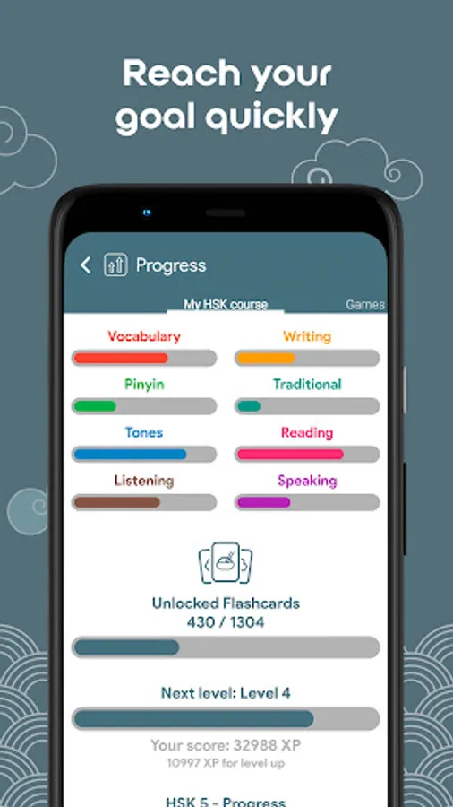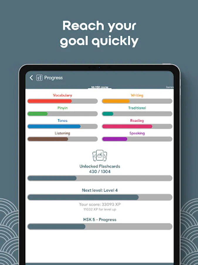 ● You are going to learn more than 5000 (HSK v2.0) / 11000 (HSK v3.0) words. You will have the official HSK v2.0 vocabulary in addition to the new HSK v3.0 vocabulary.