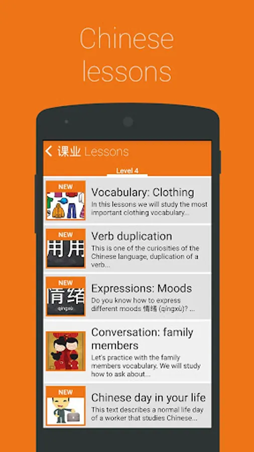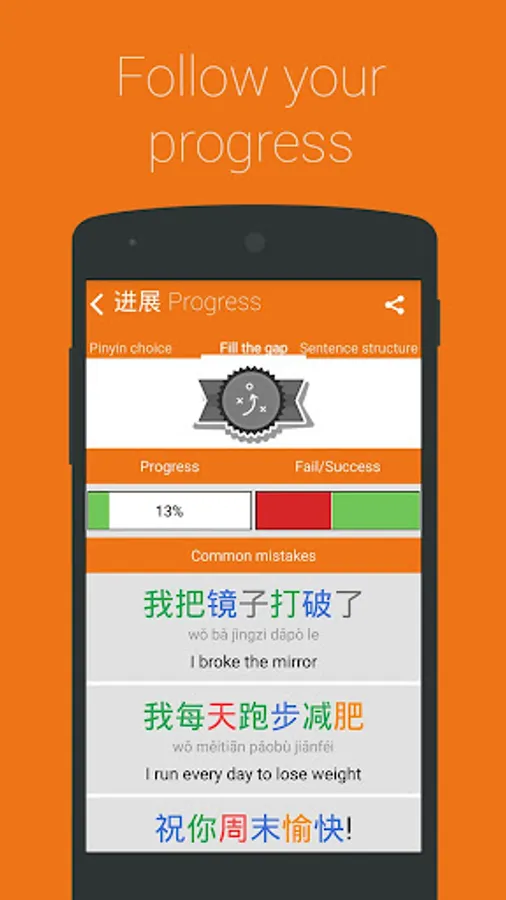 But there are more: 15 different games, +2700 challenges and 24 achievements are waiting for you. With Chinese YCT Level 4 you will listen, speak, write and play while you are checking your progress. Full stats will show your learning progress and mistakes.