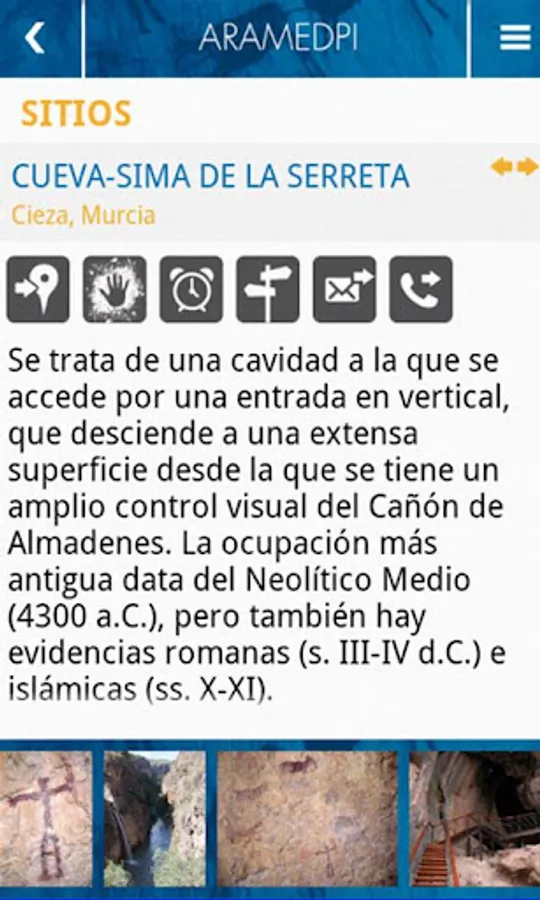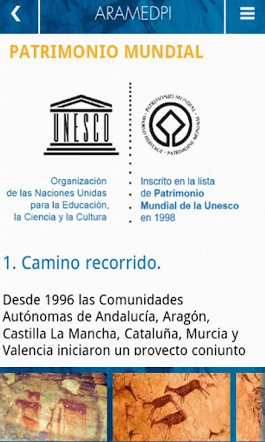 With the creation of this application for mobile devices we provide to tourists interested to visit areas close to the location of some of the sites belonging to "Rock Art of the Mediterranean Basin on the Iberian Peninsula" declared World Heritage Site by UNESCO in 1998 the possibility of a visit to these, but with the bonus of being able to correctly interpret what is being seen as through the application will have access to the page of that site with all the information available, not only that but also we will see next visited sites and interpretive centers or museums closer related to the tourist to design a route for your visit, including the services available in the vicinity, such as hotels and restaurants. Also taking advantage of the cultural of these sites with cave paintings can enjoy the places where they are usually located natural environments of high ecological and landscape value.