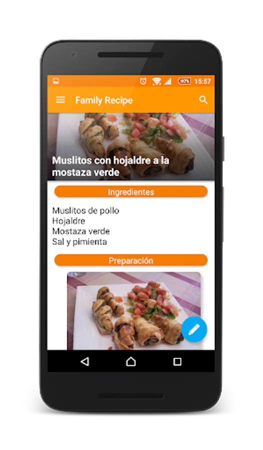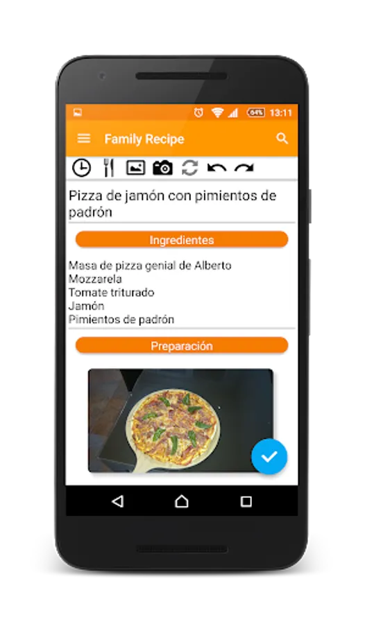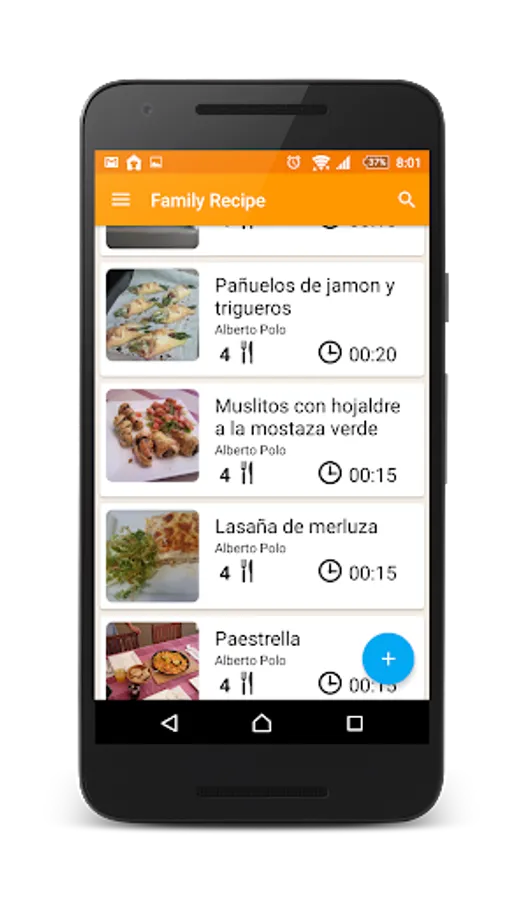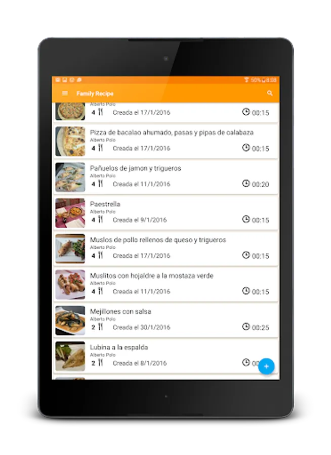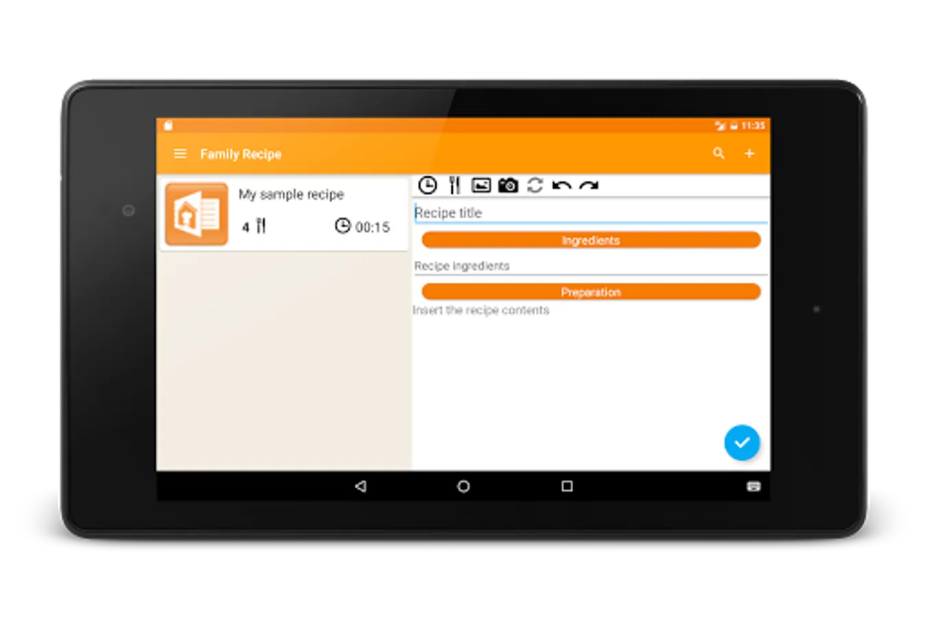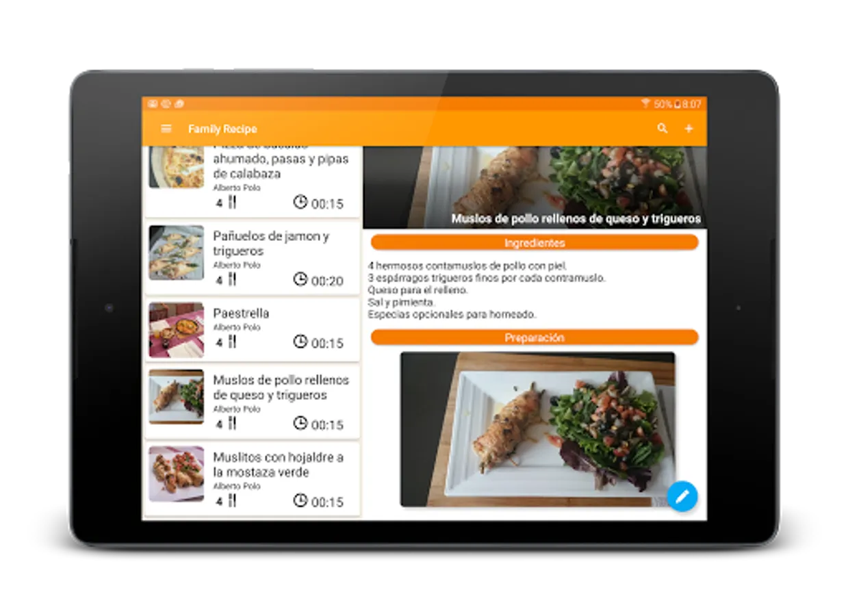 With Family Recipe you will be able to search and view, write or modify recipes telling the preparation time, the servings number, the ingredients and include pictures in the preparation procedure.
