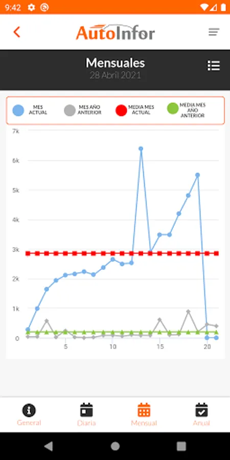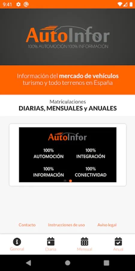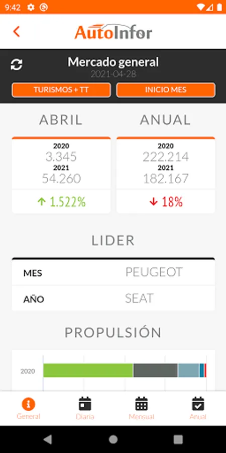 AutoInfor provides daily updated data on registrations in Spain segmented by brands and provinces. - Shows market leaders, with updated data every day. - It offers the possibility to see the data of a day, a month or a year. - It allows to compare enrollment data with respect to the previous year. - Includes data on passenger cars and all terrain. - It also makes it possible to compare the data based on the number of days that have passed and based on the number of days left to finish a month.