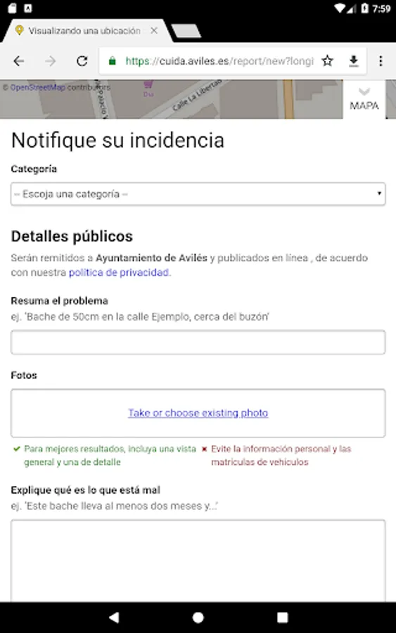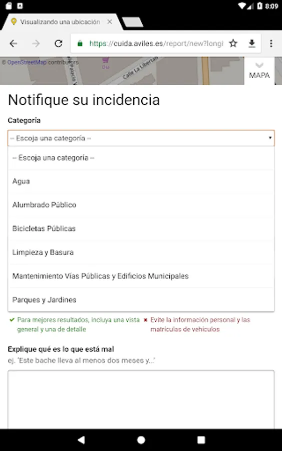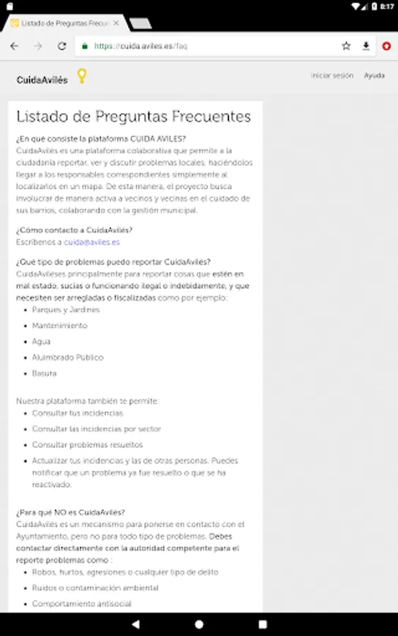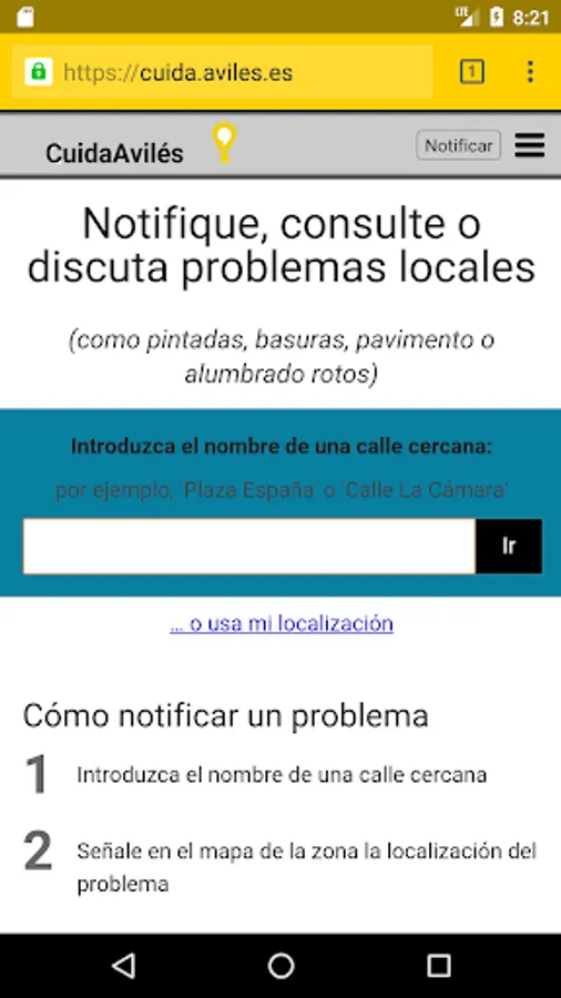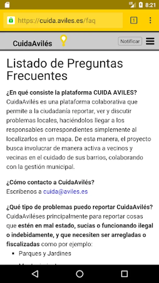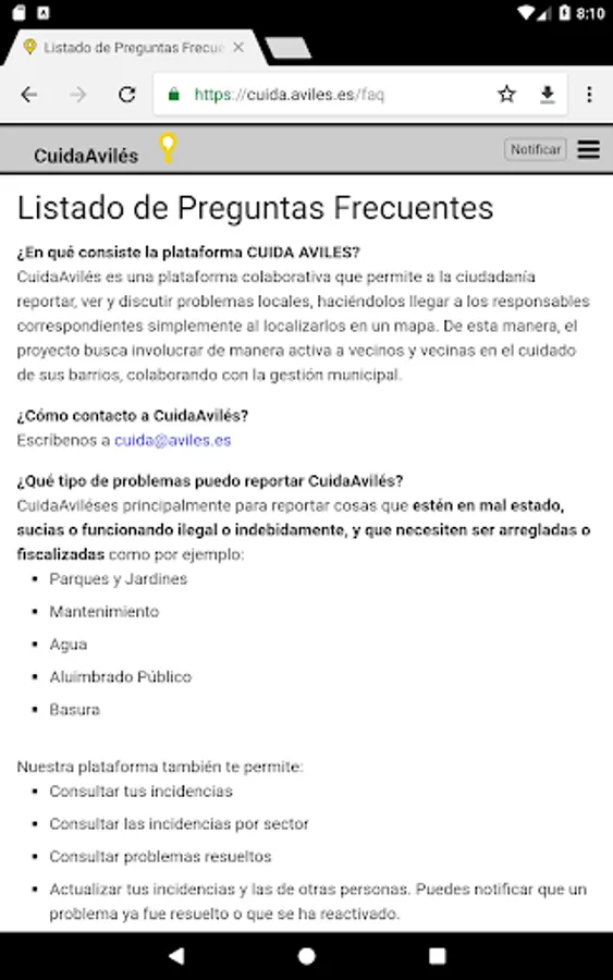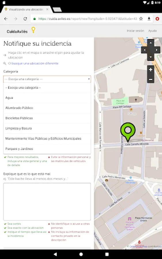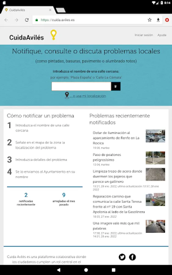 Cuida Avilés is not responsible for the content or accuracy of the information provided or shared by its users. The right is reserved to edit or remove problems or incidents that are considered inappropriate.