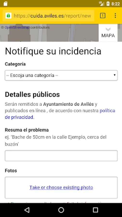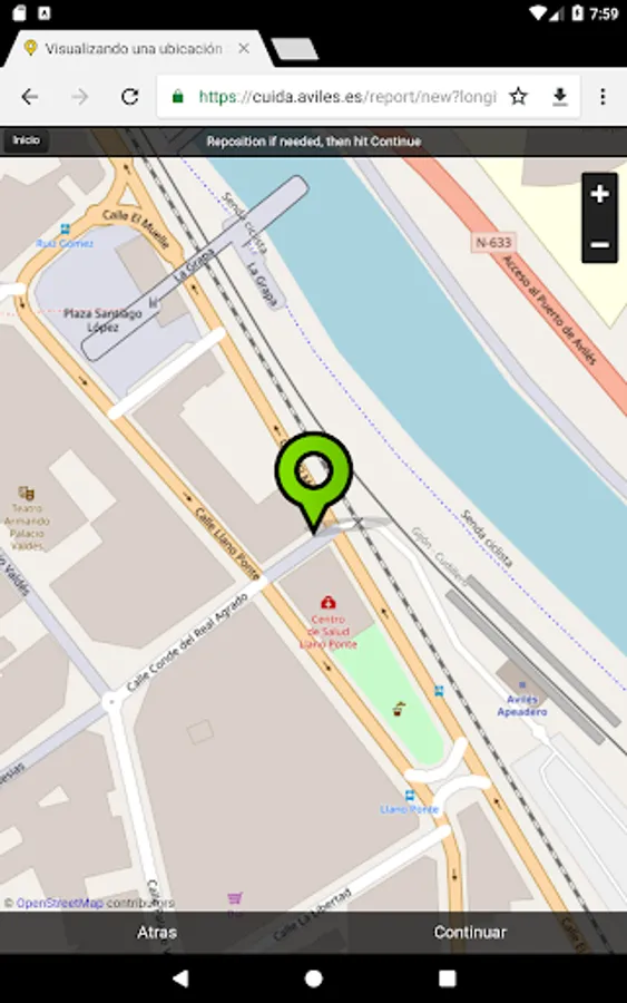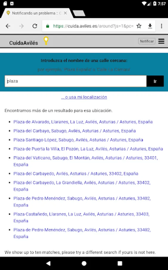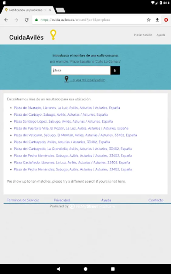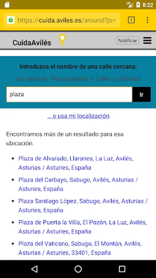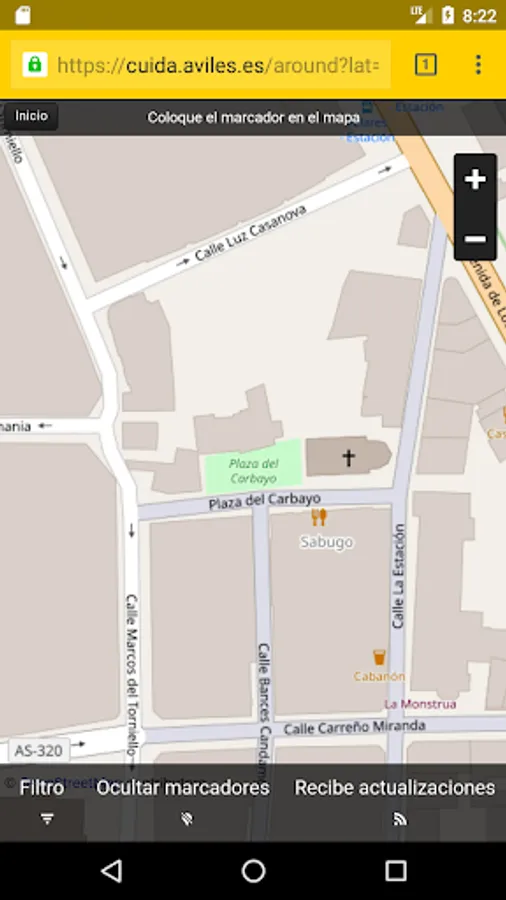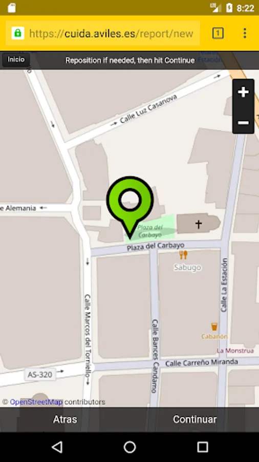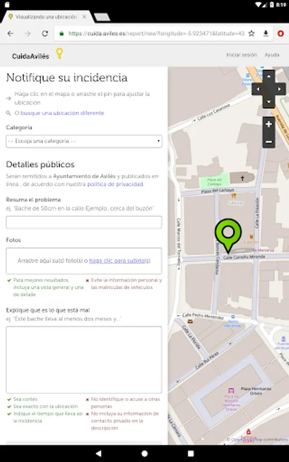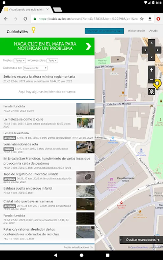 After entering a street or place, a map of Avilés appears. You can see the problems that have already been reported in the area, or make your own incidents simply by clicking on the map at the location of the problem and creating your account so that we can send you the email in which your incident will be confirmed.