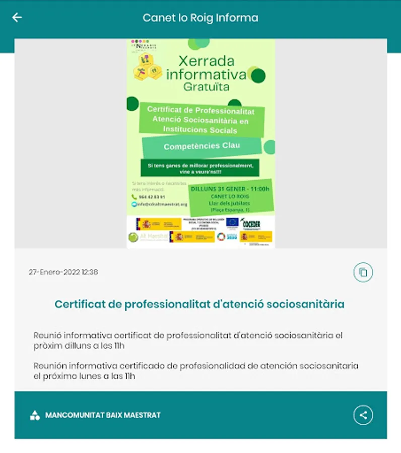 "Canet lo Roig Informa" is a communication service in real time, between the city and neighbors.