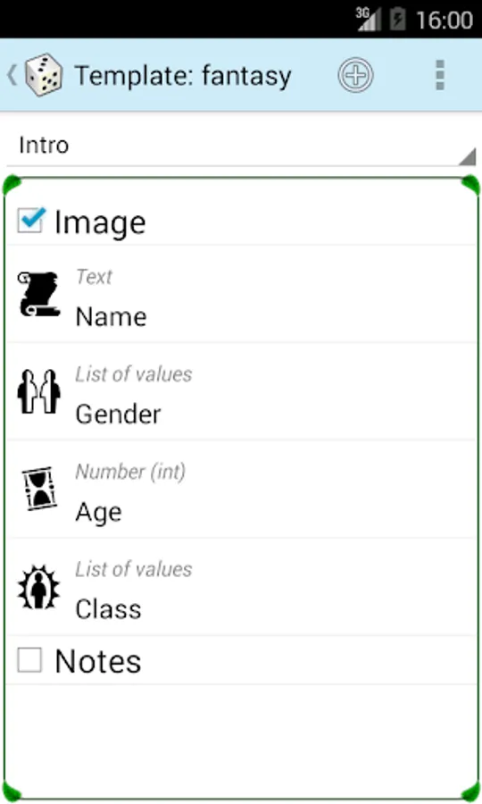 - templates: define the fields of the sheet, name, type, values, borders, images, notes;