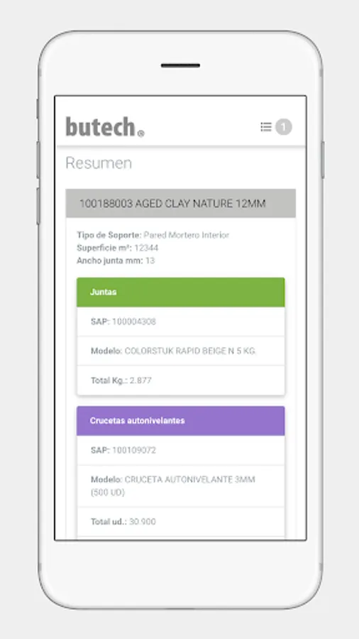 Its operation is very simple and intuitive, since the app guides you through different screens and fields in which it will only be necessary to introduce, from the SAP (model), the surface, joint width and types of adhesive and support . The Butech Calculator calculates each one of the variables, which can be modified at any time, and offers you a report with all the necessary data. One of the great advantages of the Butech Calculator is that you can share the conclusions generated from each project.