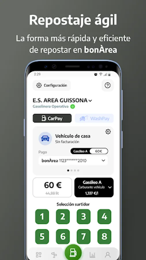 The "bonÀrea CarPay" application, for payment at bonÀrea gas stations, allows you to activate the pumps at our gas stations to refuel with a few clicks on your phone.