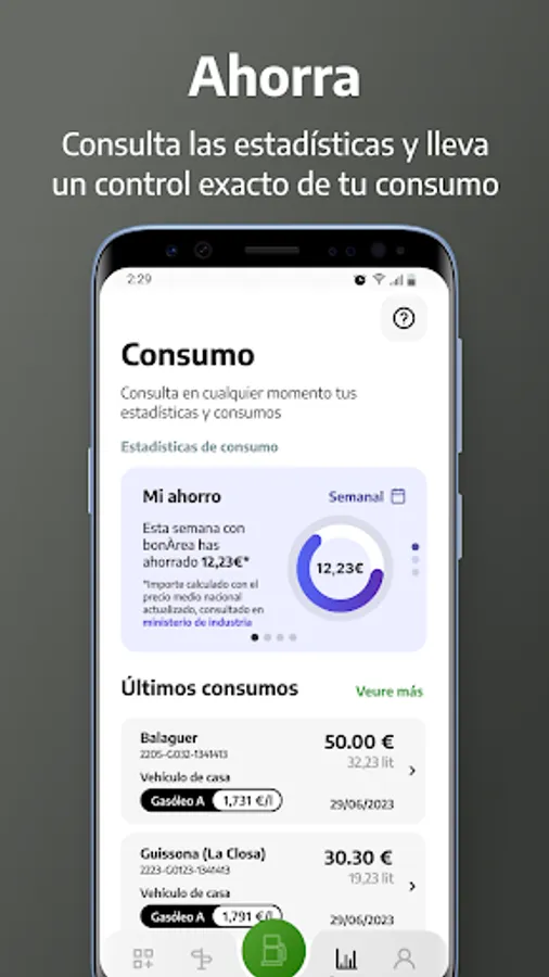 The application allows you to configure the NIF of our clients to receive the invoice, enter different forms of payment (bonÀrea card and bank cards) and configure different vehicles indicating the fuel, the payment method and the amount, in order to save having to select it each time.