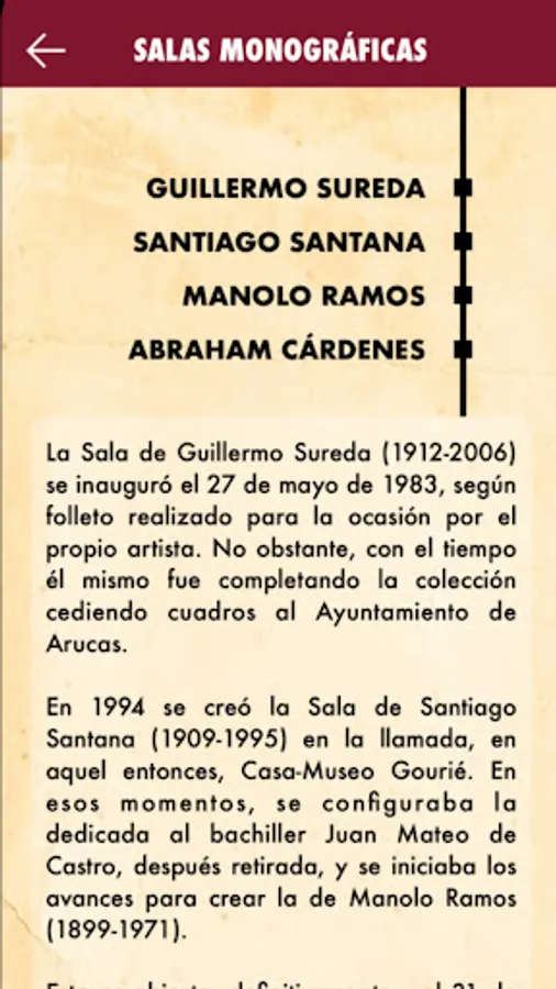 With this digital tool easily have at your fingertips the peculiarities of the Municipal Museum, Arucas, from its architectural features to the content of the permanent galleries (their most interesting artists and their works) and the services offered to visitors as the organization of exhibitions, workshops, lectures, guided tours, etc.