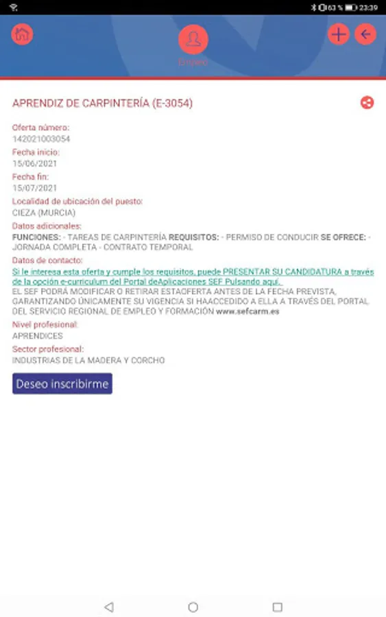 SEF Mobile is an application developed by the Regional Employment Service and Training of the Autonomous Region of Murcia in order to bring citizens services offered through mobile.