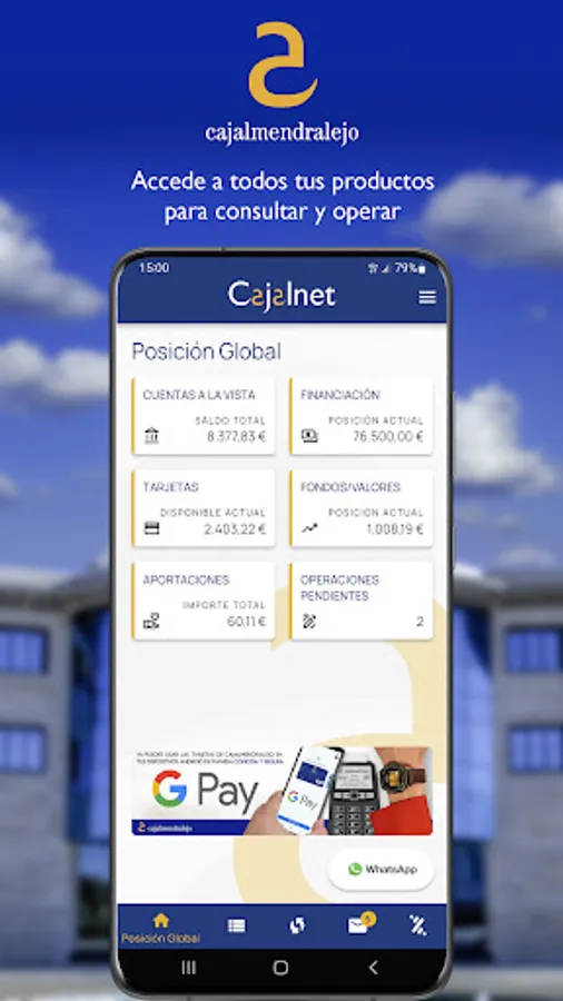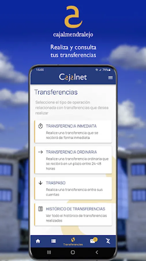 Cajalnet is a Digital Banking application that allows you to securely view from a mobile device the information on the products contracted by the user as well as use the operations available from Cajalmendralejo in real time.