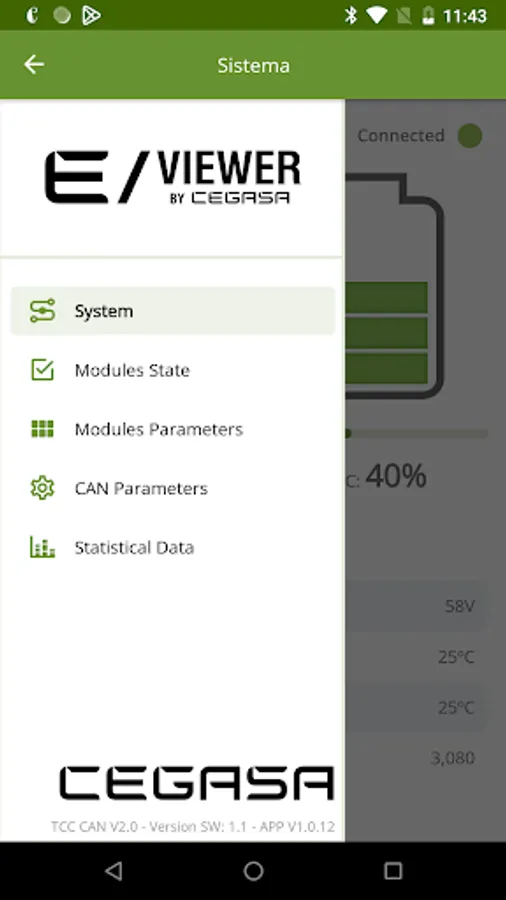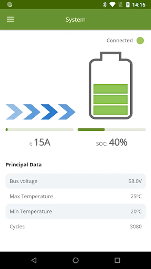 • Parameters of the complete system: system voltage, current, state of charge, temperature and cycles performed