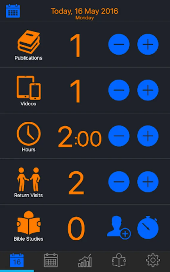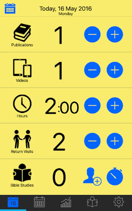 Control the Publications, Videos, Time, or Return Visits and different Studies conducted. Use the stopwatch to count time automatically as you record other values on the fly.