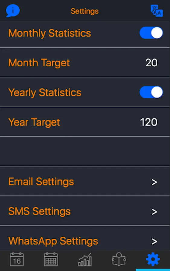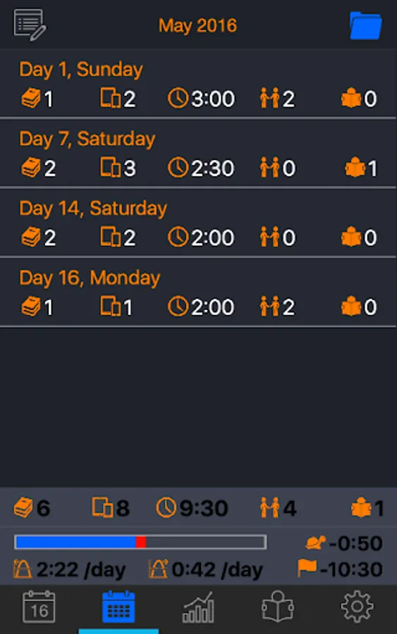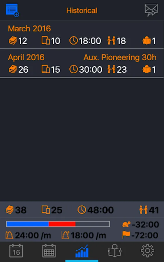 You can take a daily, monthly and yearly record. The statistics allow you to know if you are reaching your pioneering goal or personal goal. And you can know how many hours you have to do every day to meet the monthly target or your annual target. Change the mode to auxiliary pioneer 30 hours, 50 hours, Regular or Special Pioneer and the application will inform you at all times if you're ahead or behind of your goal.