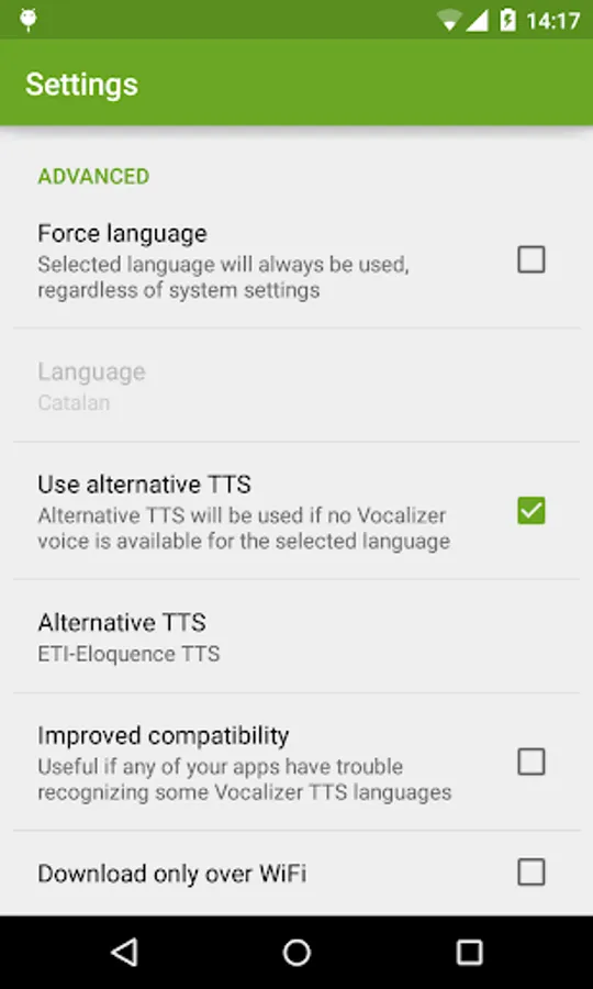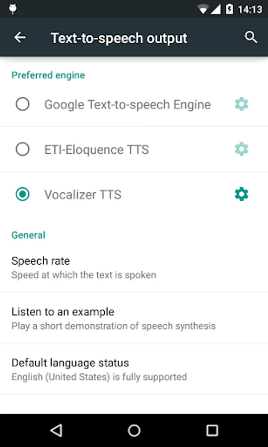Once the application is installed on your device, you can make Vocalizer your default Text-to-Speech engine by going to Settings > (System) > Language & input > (Advance) > Text-to-Speech output, and checking “Vocalizer TTS" as your default/preferred engine.