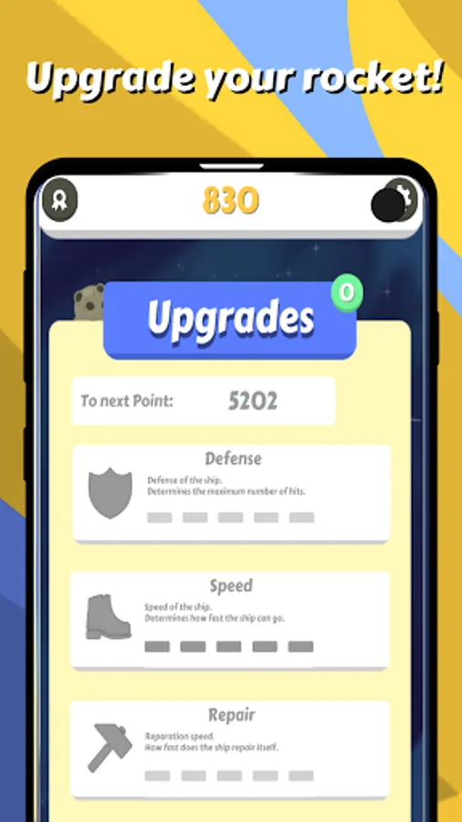 Every asteroid you dodge and every level you pass will earn you Points. When you have enough Points you will get Skill Points, which you can invest in improving your ship. When you die (yes, you are going to die) your Total Score, Best Score and Maximum Level you have reached will be sent to the Google Play Game Leaderboards, so you can challenge your friends and show who is the best.
