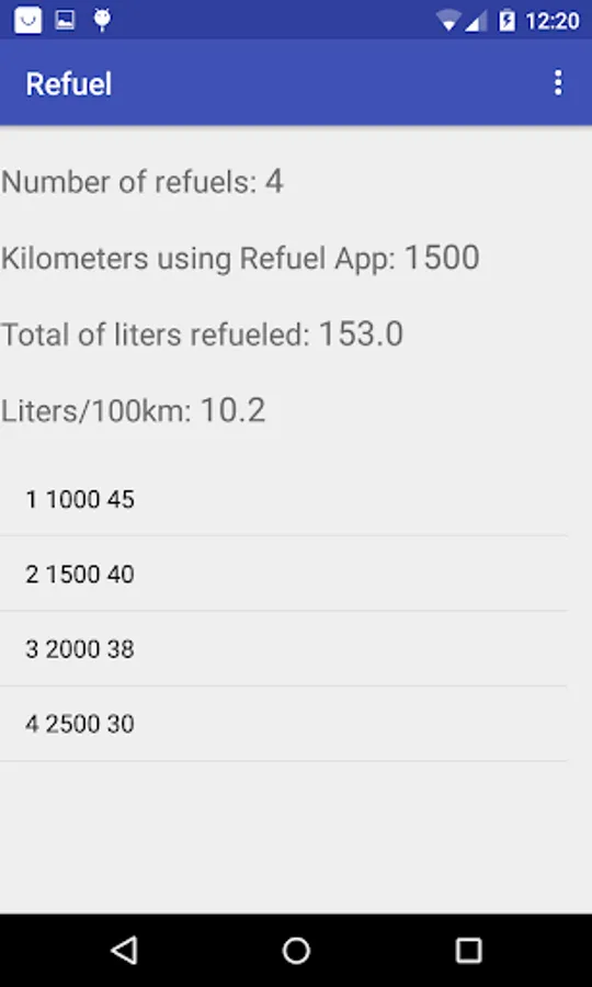 Refuel is an app created for Android That Helps you to control history of kilometers and liters That Have Been refueled in your car. Very useful Refuel as displays the total amount of droved kilometers, liters refueled and average of Liters / 100km