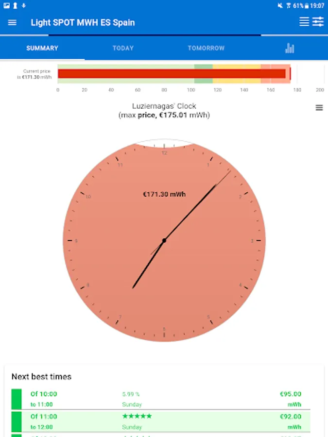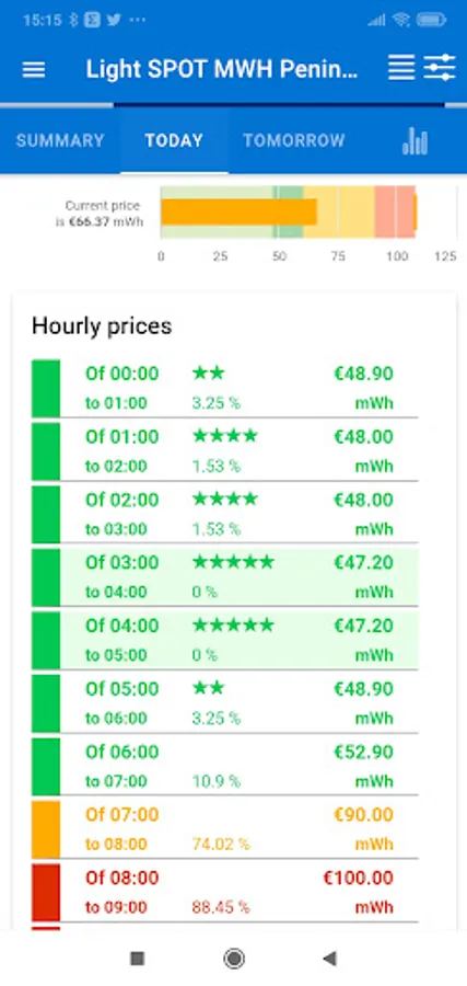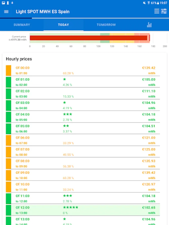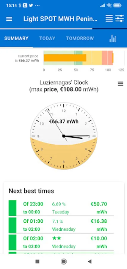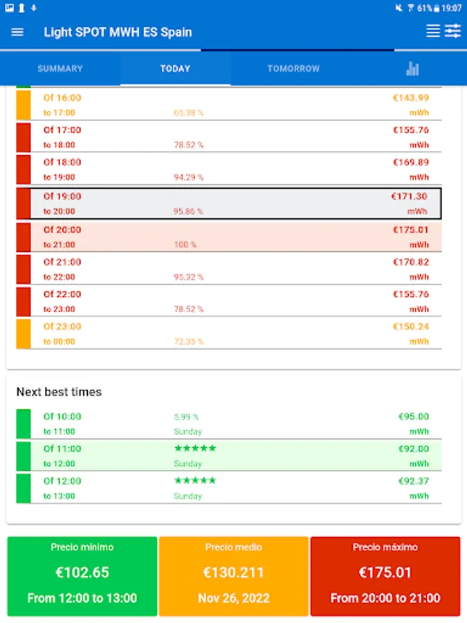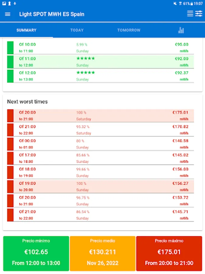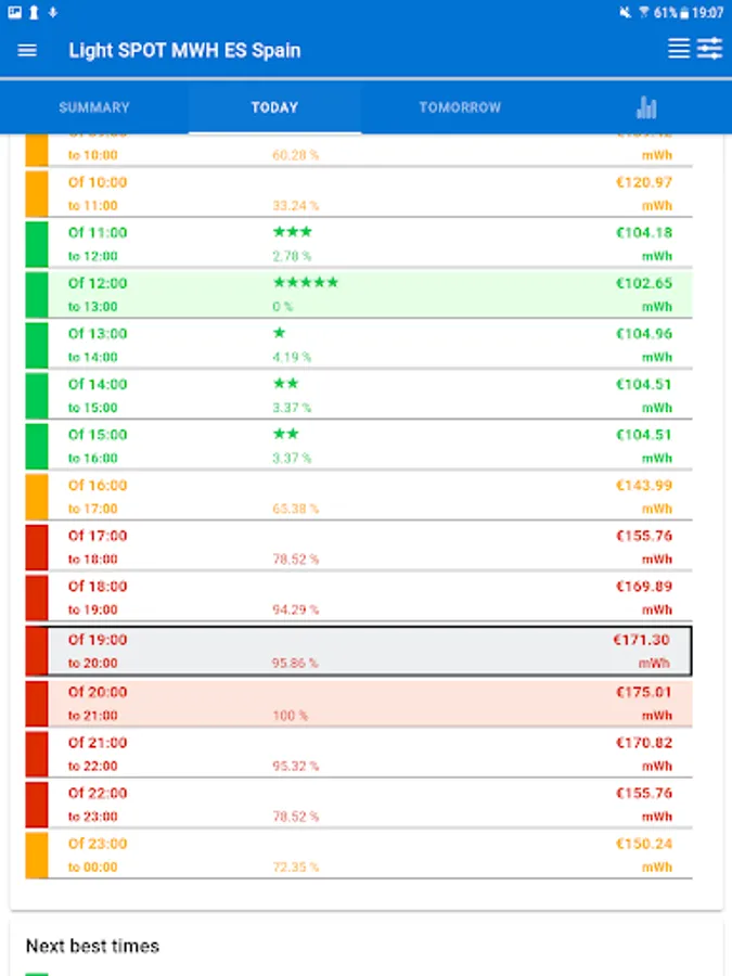 At a glance you will be able to locate the best price of the day, since the time will be highlighted with a green background and, in addition, with 5 green stars.