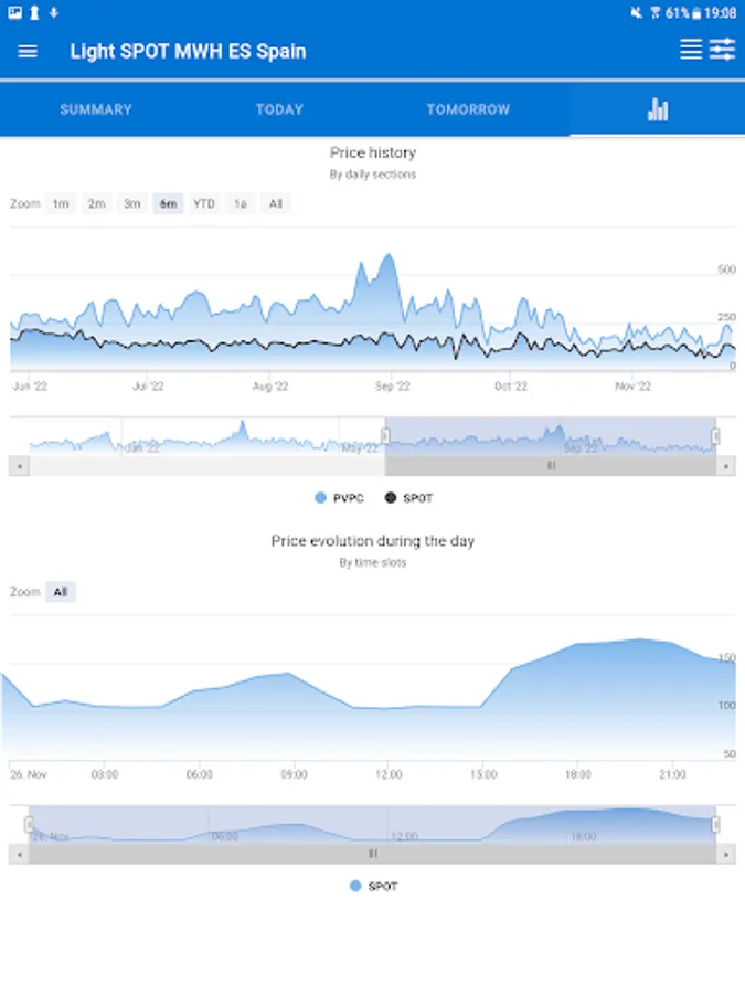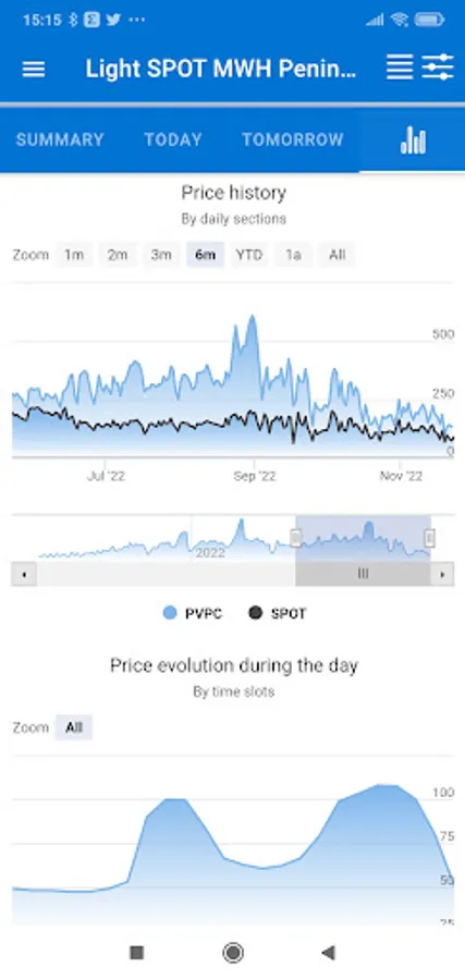 You can consult the daily evolution of the price in the form of a graph. You can also see the entire price history, comparing the PVPC price and the SPOT price so that you can easily see how they evolve with respect to each other.