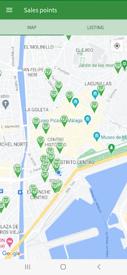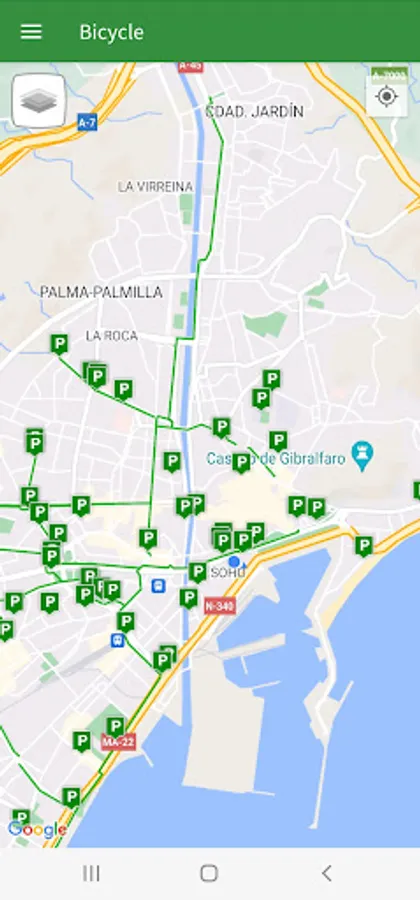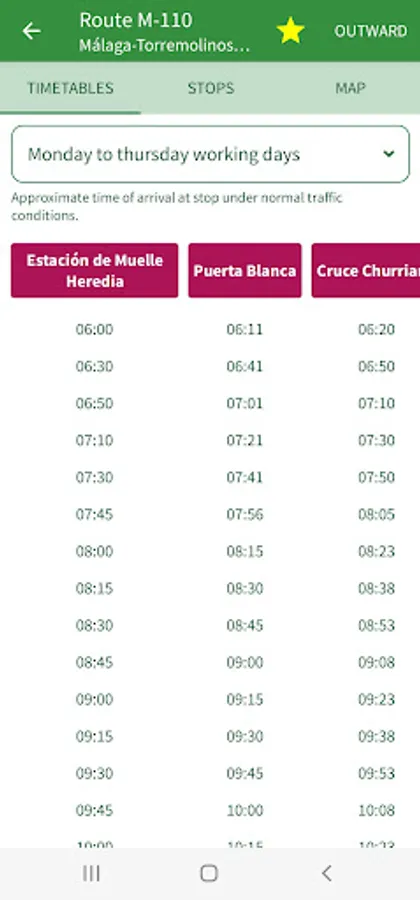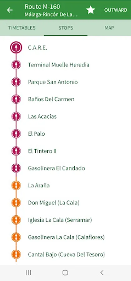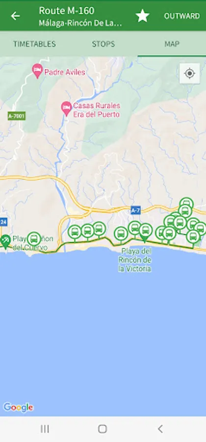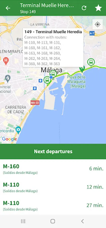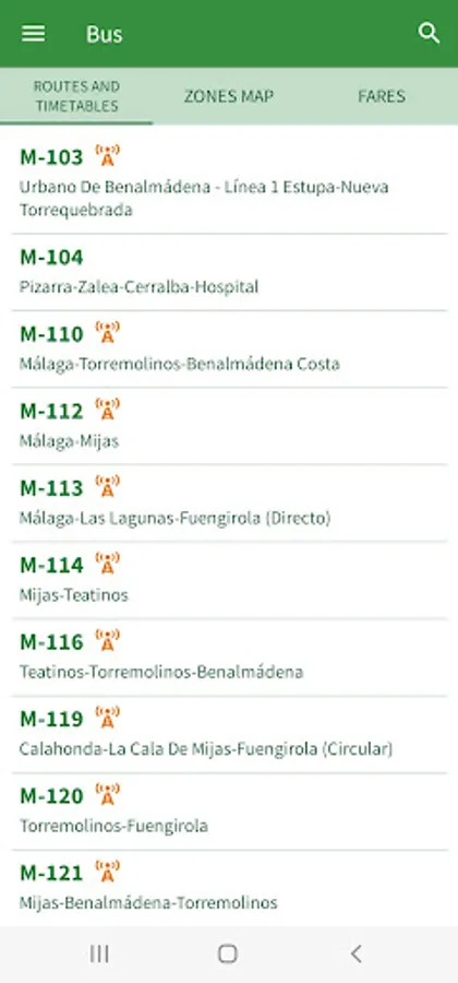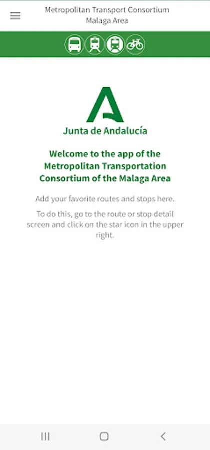 The app includes details of public transport (buses, Málaga subway, Renfe suburban trains and bicycles) serving the towns and villages of Alhaurin de la Torre, Alhaurin el Grande, Almogia, Alora, Benalmadena, Cartama, Casabermeja, Colmenar, Fuengirola, Malaga, Mijas, Pizarra, Rincon de la Victoria, Torremolinos and Totalan.