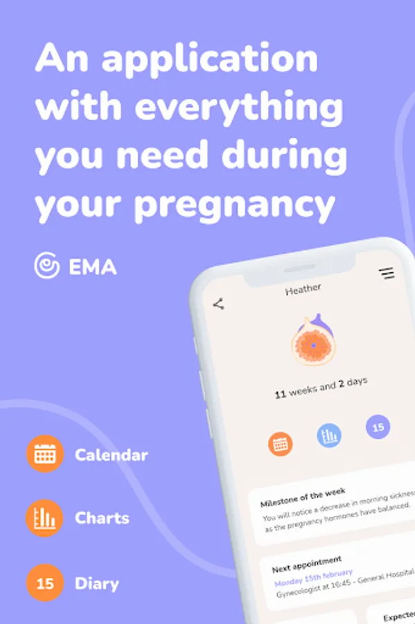 EMA features a pregnancy calendar and diary with medical appointments, photos, and tracking of symptoms and emotions. It also includes useful information about pregnancy, weekly blog articles, and tips on mother care so you can track your baby's growth week by week.