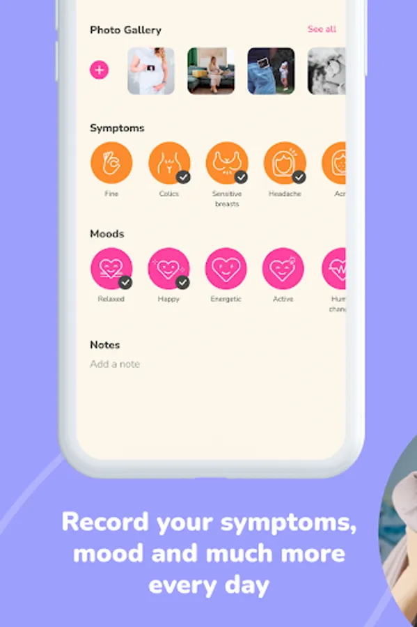 Add photos and record your symptoms in a diary you can consult whenever you want, so you can keep track of your day-to-day pregnancy journey.