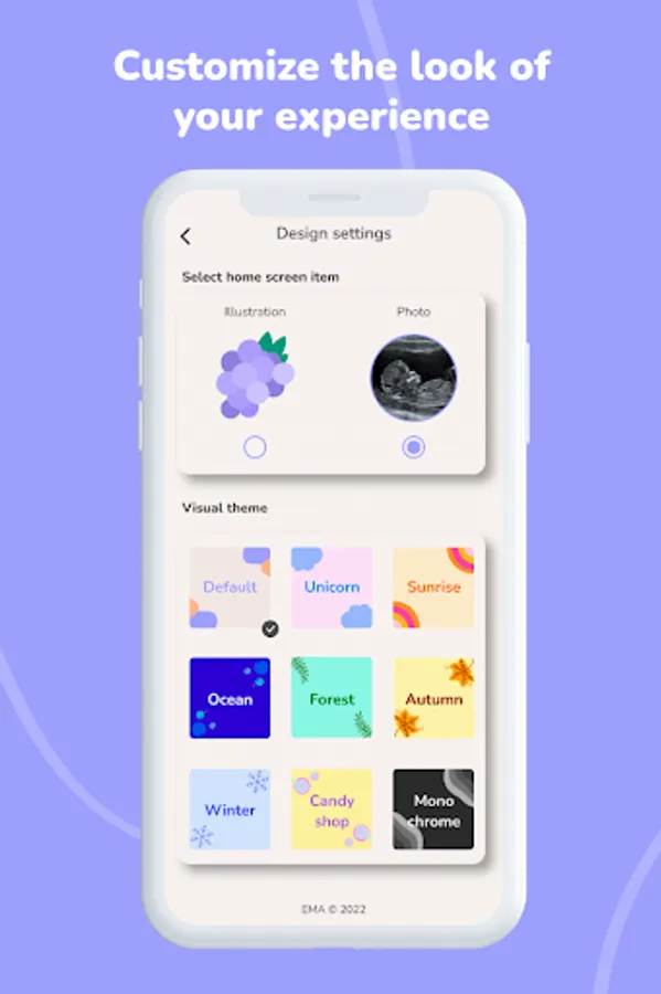 With this beautiful and well-designed pregnancy tracker app, you'll have a personalized experience. You will be able to change the visual theme to choose the one you like the most. Customization allows you to feel that the app is designed for you and your needs.