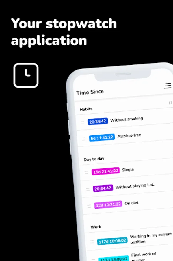 Download Time Since to activate multiple stopwatches and fall in love with the amazing options it includes: widgets, restart history, notifications when a time counter reaches targets, reset or start a days counter from a past date, categories to organize the stopwatches and much more.