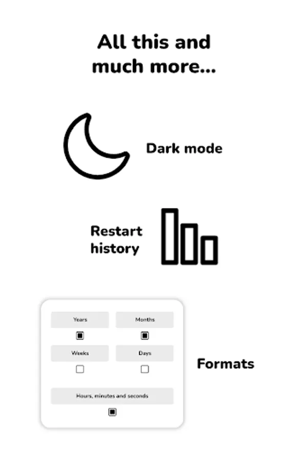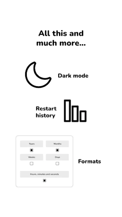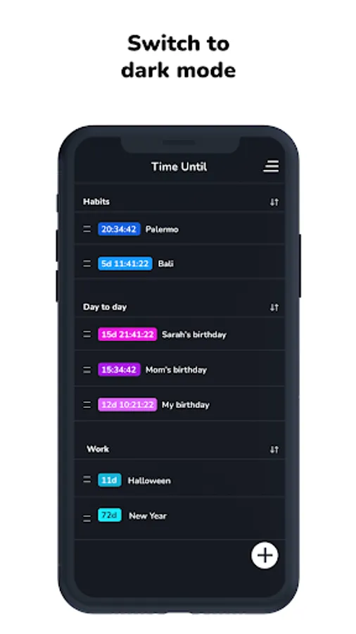 Set the individual format of each timer. Count years, count months, count weeks, count days and/or count hours, minutes and seconds remaining till a dream trip, for example. Free version has 1 format.