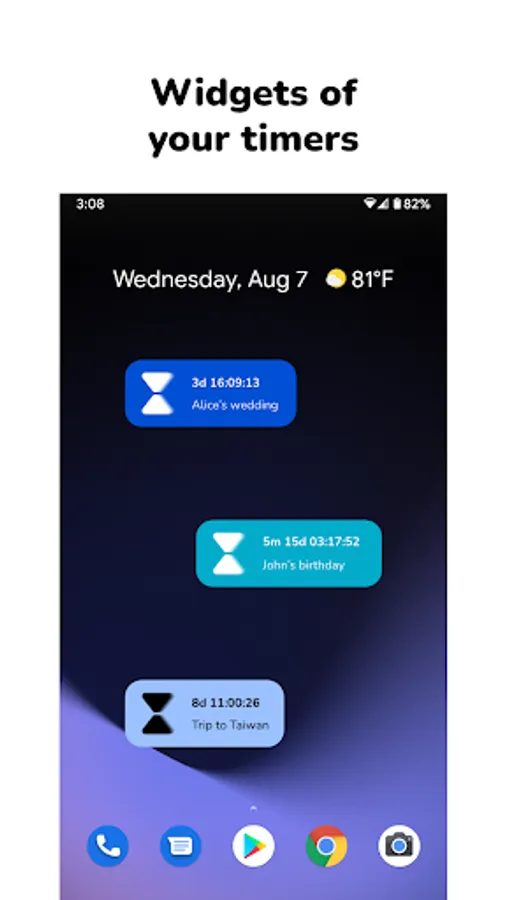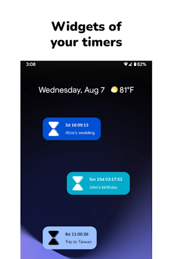 Count the days until an event or keep track of the time left until your wedding or any time in the future with this multi timer app with widgets. For example, it's perfect for making sure you don't miss any birthdays of people you care about (it will let you know a few days before so you can plan the gift!)