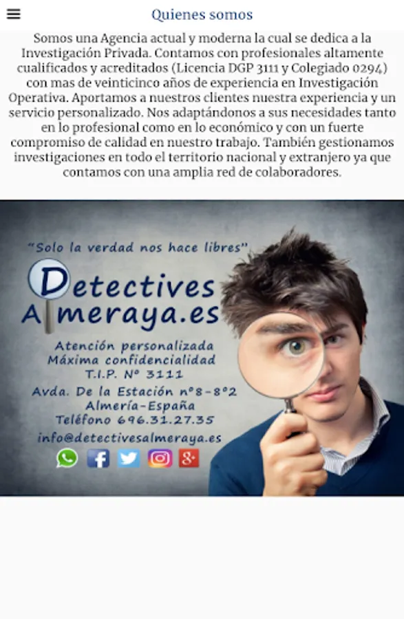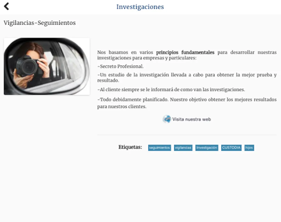 We have highly qualified and accredited professionals (DGP License 3111) with more than twenty-five years of experience in Operations Research. We provide our clients with our experience and personalized service. We adapt to your needs both professionally and economically and with a strong commitment to quality in our work. We also manage investigations throughout the national and foreign territory since we have a wide network of collaborators.