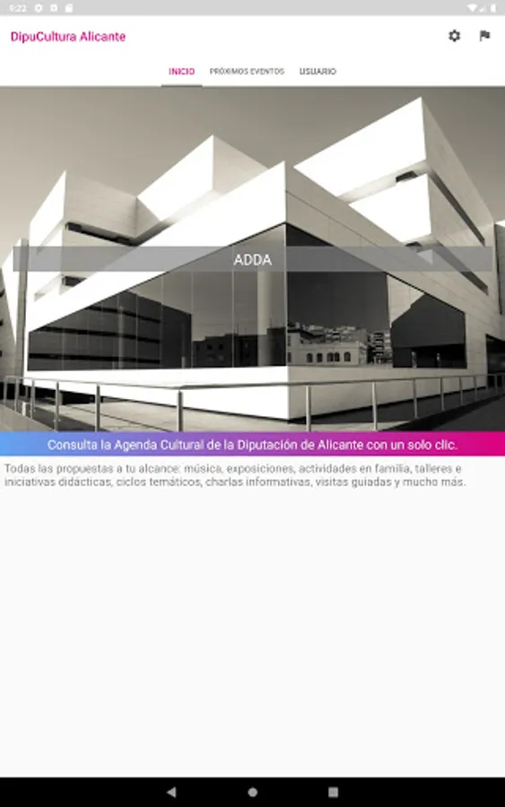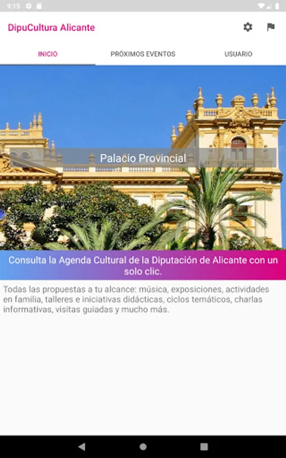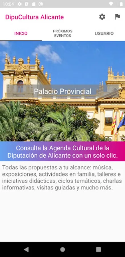 The Diputación de Alicante brings you culture through its Official App. Consult an extensive program of music, exhibitions, family activities, workshops, guided tours and much more.