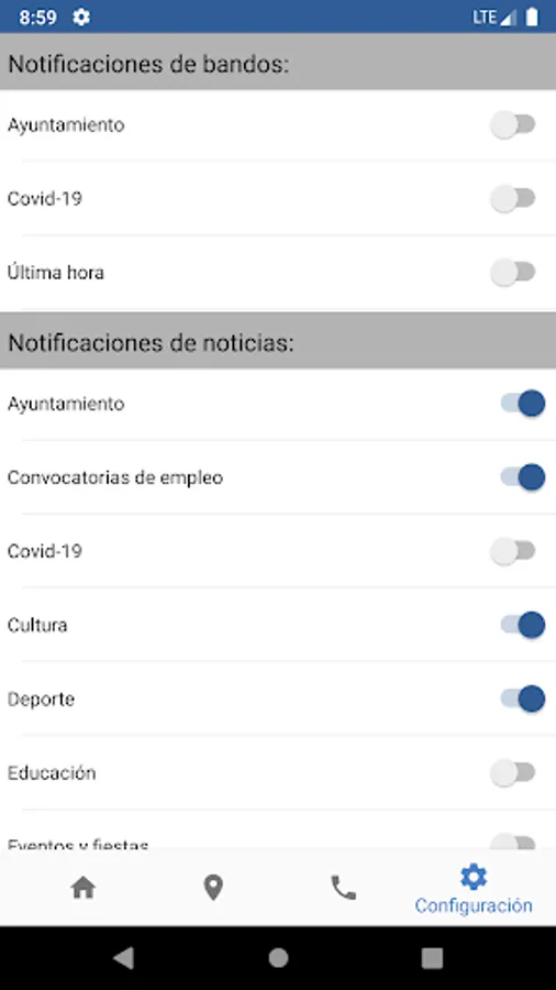 If the citizen is interested in receiving notifications of new content, they must give their consent to the sending of notifications by the City Council, enabling them through the "Application notifications" menu of their Android operating system. In addition, you can select in the mobile application the contents about which you want to be notified from the configuration option of the main menu. This consent can be withdrawn with the same ease with which it was given, through the indicated means, without affecting the notifications received before the withdrawal. You can obtain more information in the "Privacy Policy" section.