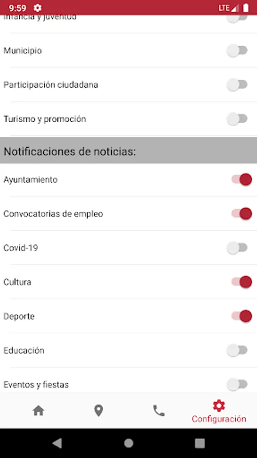 If the citizen is interested in receiving notifications of new content, they must give their consent to the sending of notifications by the City Council, enabling them through the "Application notifications" menu of their Android operating system. In addition, you can select in the mobile application the contents about which you want to be notified from the configuration option of the main menu. This consent can be withdrawn with the same ease with which it was given, through the indicated means, without affecting the notifications received before the withdrawal. You can obtain more information in the "Privacy Policy" section.