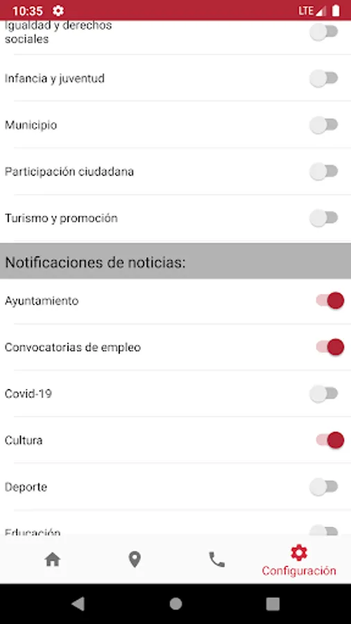 If the citizen is interested in receiving notifications of new content, they must give their consent to the sending of notifications by the City Council, enabling them through the "Application notifications" menu of their Android operating system. In addition, you can select in the mobile application the contents about which you want to be notified from the configuration option of the main menu. This consent can be withdrawn with the same ease with which it was given, through the indicated means, without affecting the notifications received before the withdrawal. You can obtain more information in the "Privacy Policy" section.